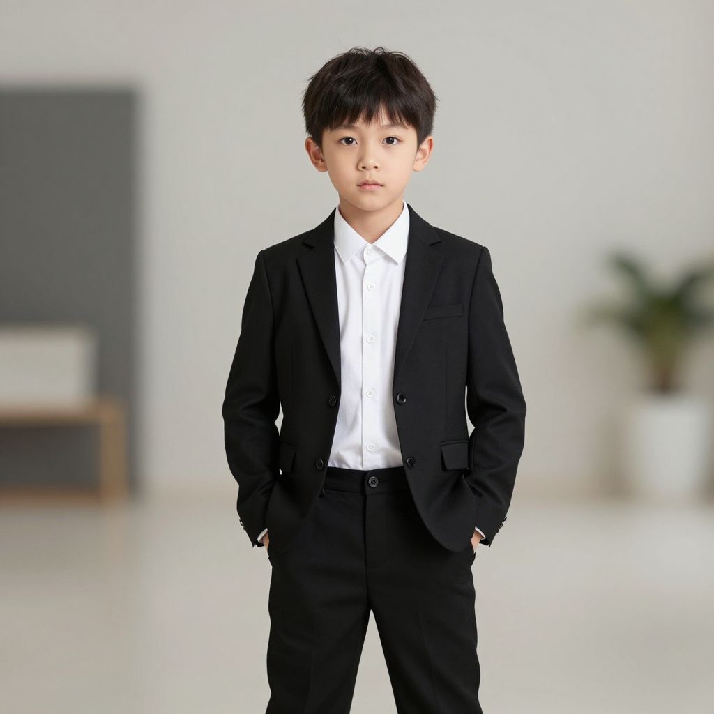 Photograph of an Asian young boy with short black hair, wearing a black suit and white shirt, standing confidently with hands in pockets, in a modern