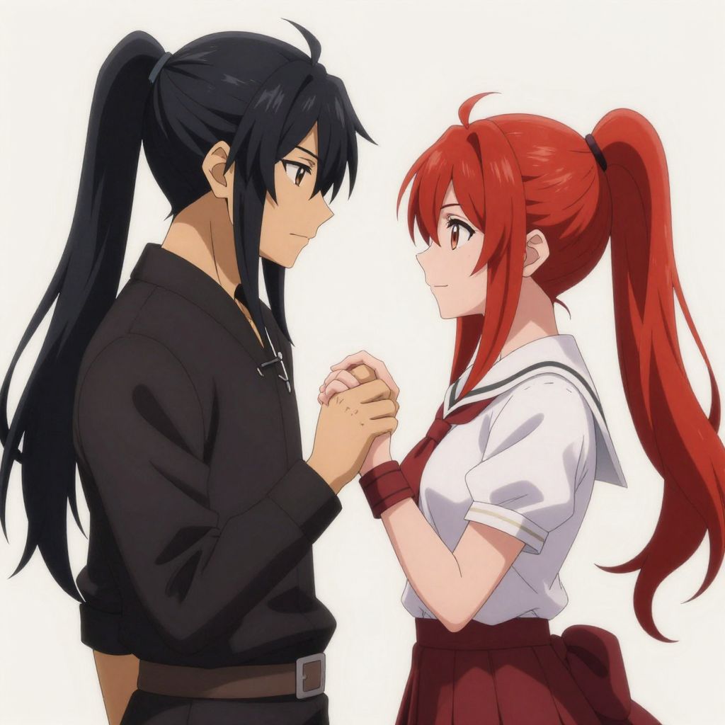 Two anime characters, a man with long black hair tied in a ponytail and a woman with vibrant red hair styled in a high ponytail, stand facing each other, holding hands tenderly against a soft, neutral background.
