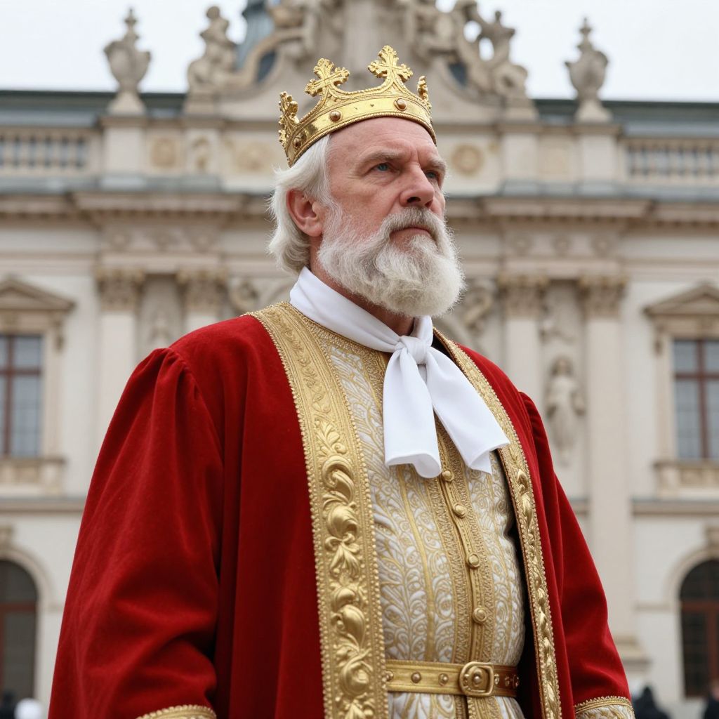 A man with a white beard and a red and gold outfit is standing in front of an ornate building. The man is wearing a crown on his head and has a white scarf around his neck. He has a strong, imposing presence, with a determined expression, and his white beard adds to his regal appearance. The ornate building in the background features intricate details and grand architecture, emphasizing the man's noble status and the grandeur of the scene.