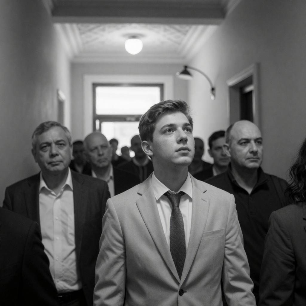 Black and white photograph of a crowded hallway. Young man in light suit with tie in foreground, looking up. Older men with serious expressions in background. Ornate ceiling with patterned design. Lamp with curved arm on right. Sunlight at end of hallway.