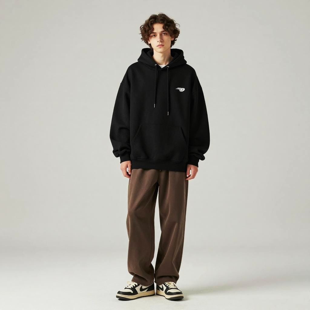 Young Man in Black Hoodie and Brown Pants