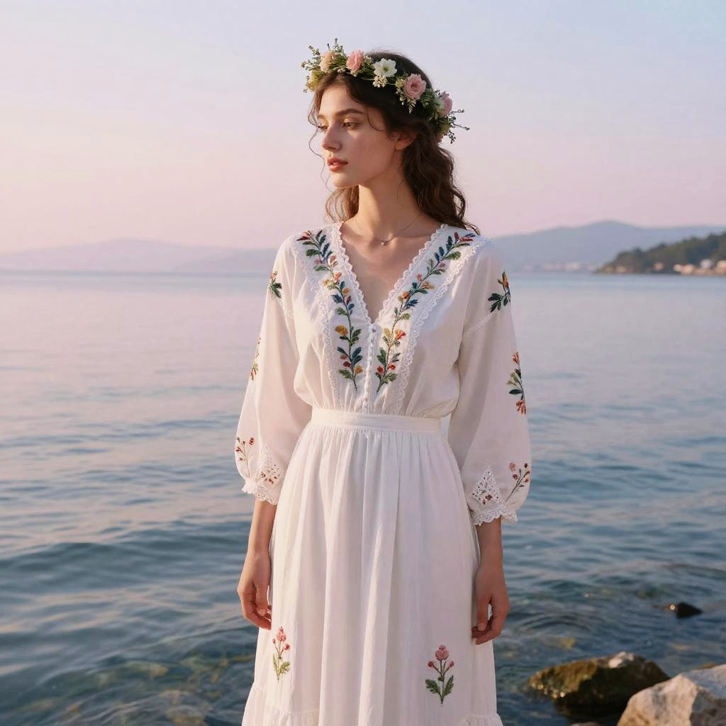 Elegant white maiden dress with vintage embroidery, worn by a serene young woman standing by a crystal clear lake under a pastel sunset sky, delicate floral crown