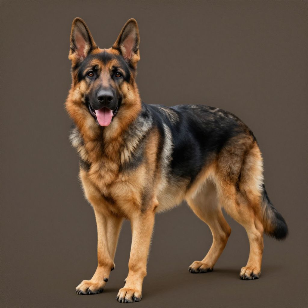 Photograph of a German Shepherd with a black and tan coat, standing on a dark brown background, tongue out, alert and upright.