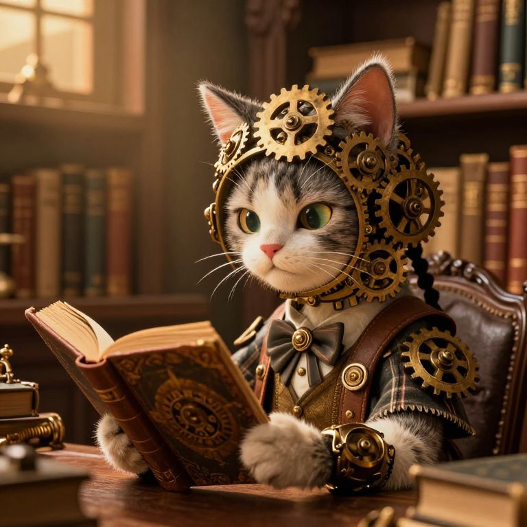 In a whimsical steampunk-inspired setting, a clockwork librarian adorned with vintage gears and cat-like ears peruses an antique tome, surrounded by shelves of books under warm, golden-hour lighting, evoking a timeless blend of fantasy and nostalgia.