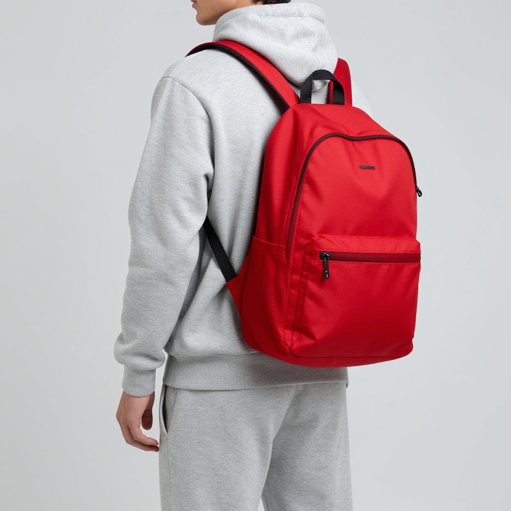 Man in grey hoodie and grey sweatpants with a red backpack on his back.