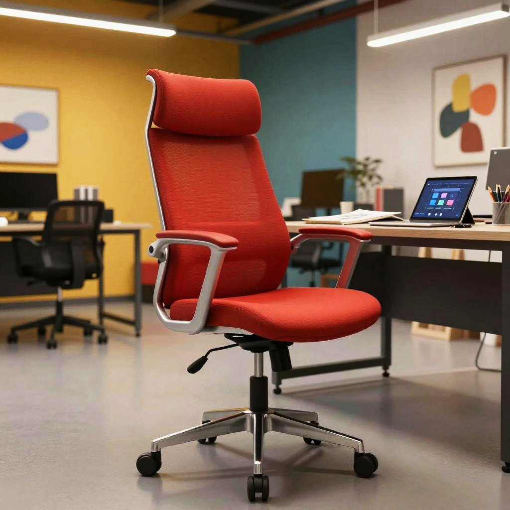 Bürostuhl in bright red color, futuristic style with ergonomic curves and swivel base, located in a creative studio with colorful walls and abstract art, industrial ceiling lights, cluttered desk with sketchbooks and digital tablet