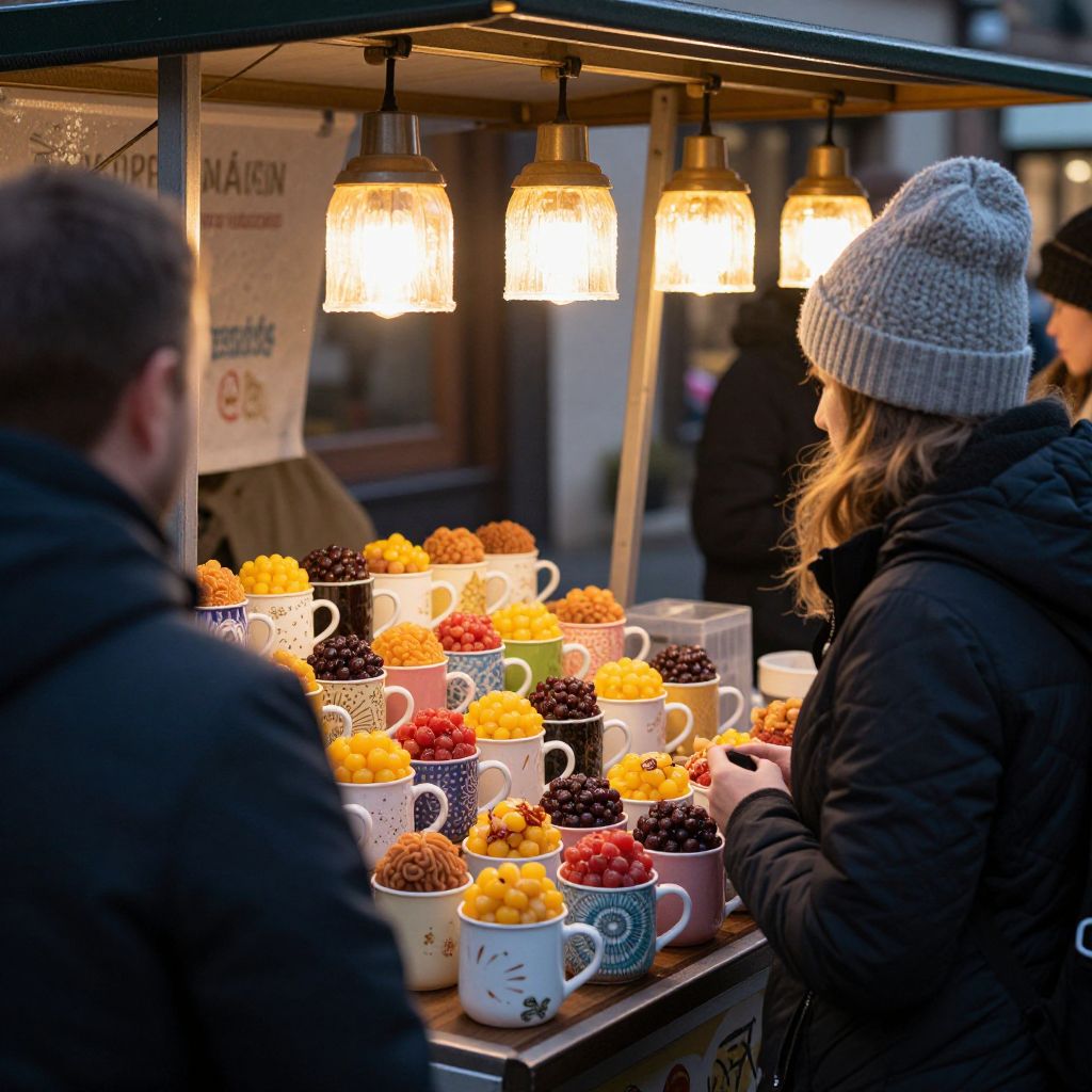 Street vendor's stall glows warmly with hanging lamps as customers, including a woman in a gray beanie and dark jacket, select colorful mugs filled with vibrant, spherical treats arranged in neat rows, evoking a whimsical sense of time and flavor.