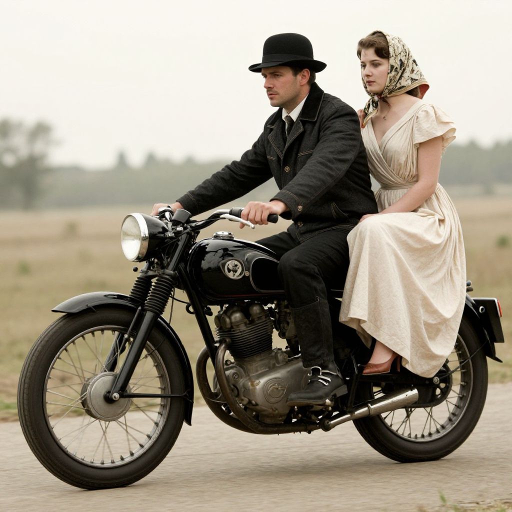 Photograph of a couple riding a vintage black motorcycle on a rural road. The man, wearing a black suit and bowler hat, sits in the front and steers. The woman, dressed in an off-white, knee-length dress with a floral headscarf, sits behind him. The motorcycle has a classic design with round headlights and chrome accents. The background features a blurred, grassy field under an overcast sky. The image has a slightly vintage, sepia-toned filter, adding a nostalgic feel. The couple's expressions are focused, and the overall mood is romantic and adventurous.