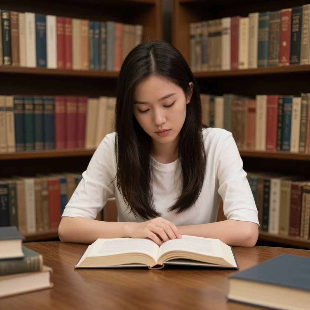 Asian woman with long black hair, wearing a white shirt, sits in a library reading an open book, surrounded by bookshelves. Photographic image