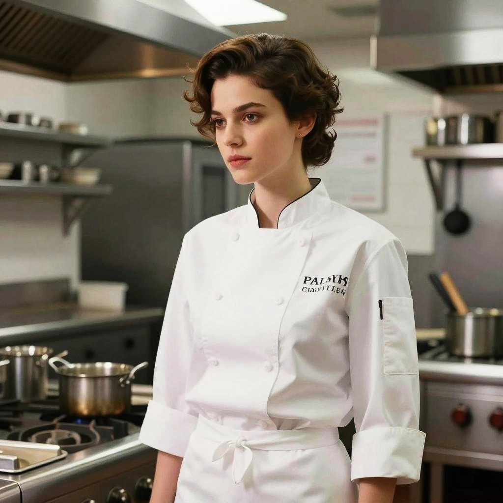 Van Dyke hairstyle on female chef, wearing white chef coat, in restaurant kitchen, captured in fashion editorial style with bright overhead lighting.