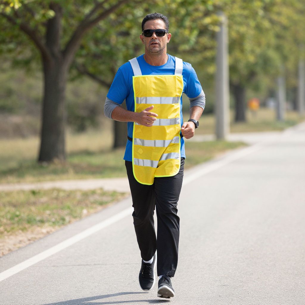Photograph of a fit man jogging on a sunlit tree-lined road, wearing a blue shirt, black pants, yellow reflective vest, and black sunglasses