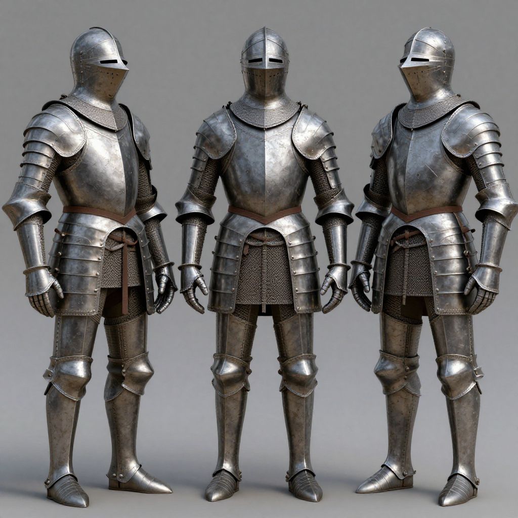Reference for 3d modeling, medieval knight armor set, high-res metal textures, various angles, weathered and battle-scarred, soft shadow, neutral backdrop