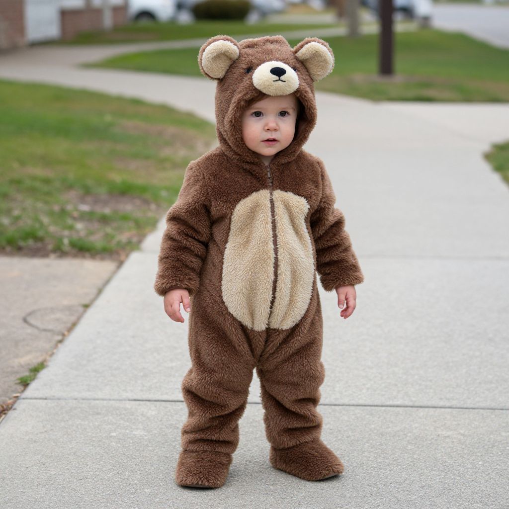 Toddler Costume, child in a bear costume standing on a sidewalk
