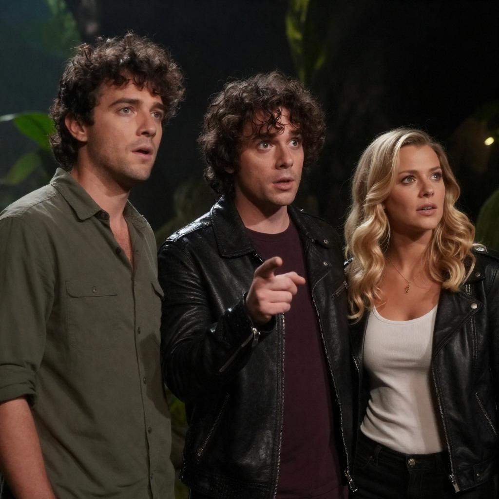 Photograph of two men with jungle-themed costumes, standing side by side. A yellow, cartoonish dog with white fur and large eyes sits on the man on the left's shoulder. Both men have surprised expressions. The background features lush greenery and a rock. Yellow bungee cords wrap around them. The man on the left has curly brown hair and wears a dirty, greenish shirt. The man on the right has short, curly black hair, a green shirt, and a brown jacket. The dog's right paw rests on the left man's shoulder.