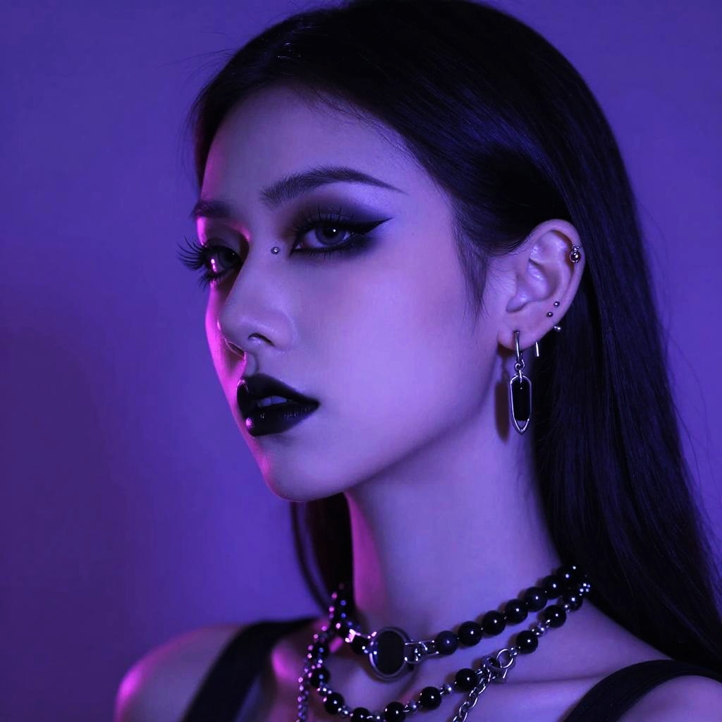 Portrait of a model with goth industrial piercing, multiple piercings on ear, pale skin contrasted by black jewelry, heavy eyeliner, neon purple lighting, cyberpunk aesthetics