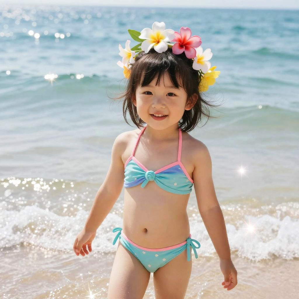 Small girl bikini, fantasy beach scene, sparkling water, exotic flowers, magical glow, whimsical and dreamy atmosphere, vibrant and detailed character design