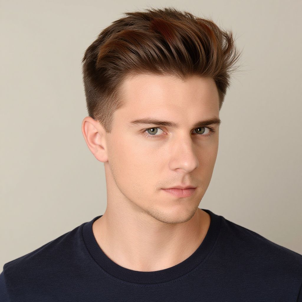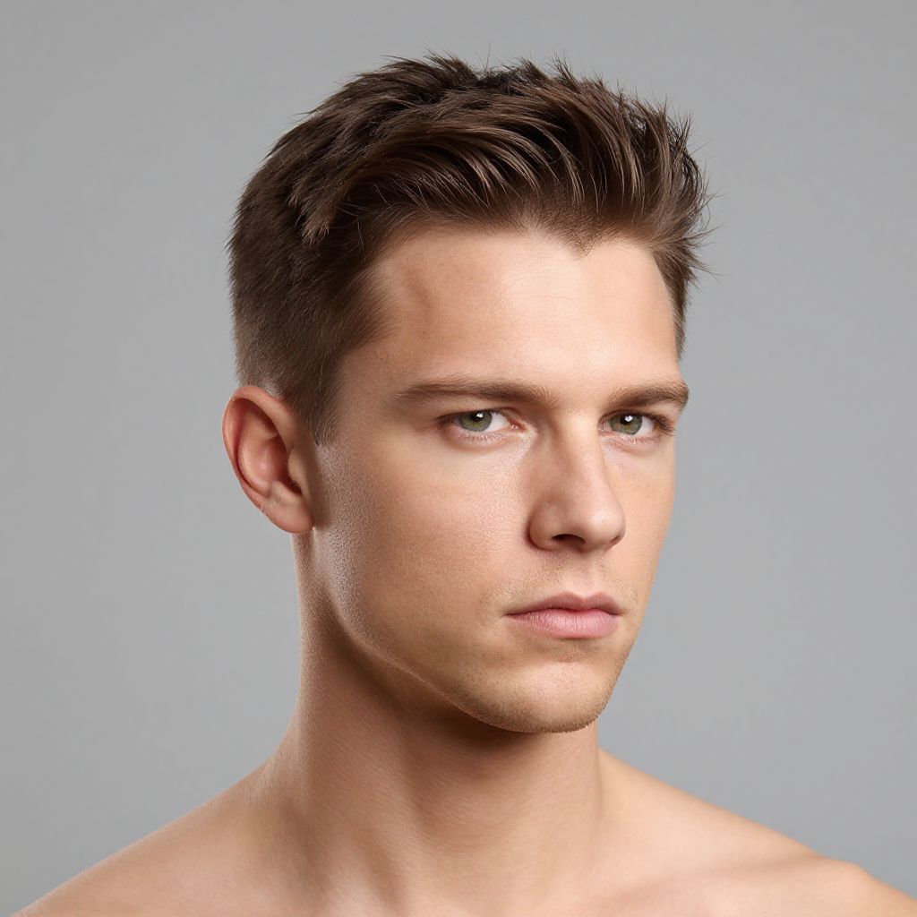 Classic Blowout, fit European man, natural hair texture with a sleek finish, minimalist background, soft shadows, professional portrait photography, realistic style