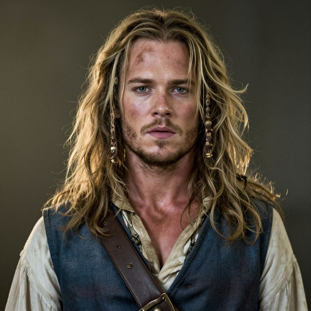 Photo portrait of a rugged irish pirate, young adult, blonde hair and clean shaven face, faded blue vest, charismatic face, rugged and dirty, cinematic lighting at sundawn, movie color grading