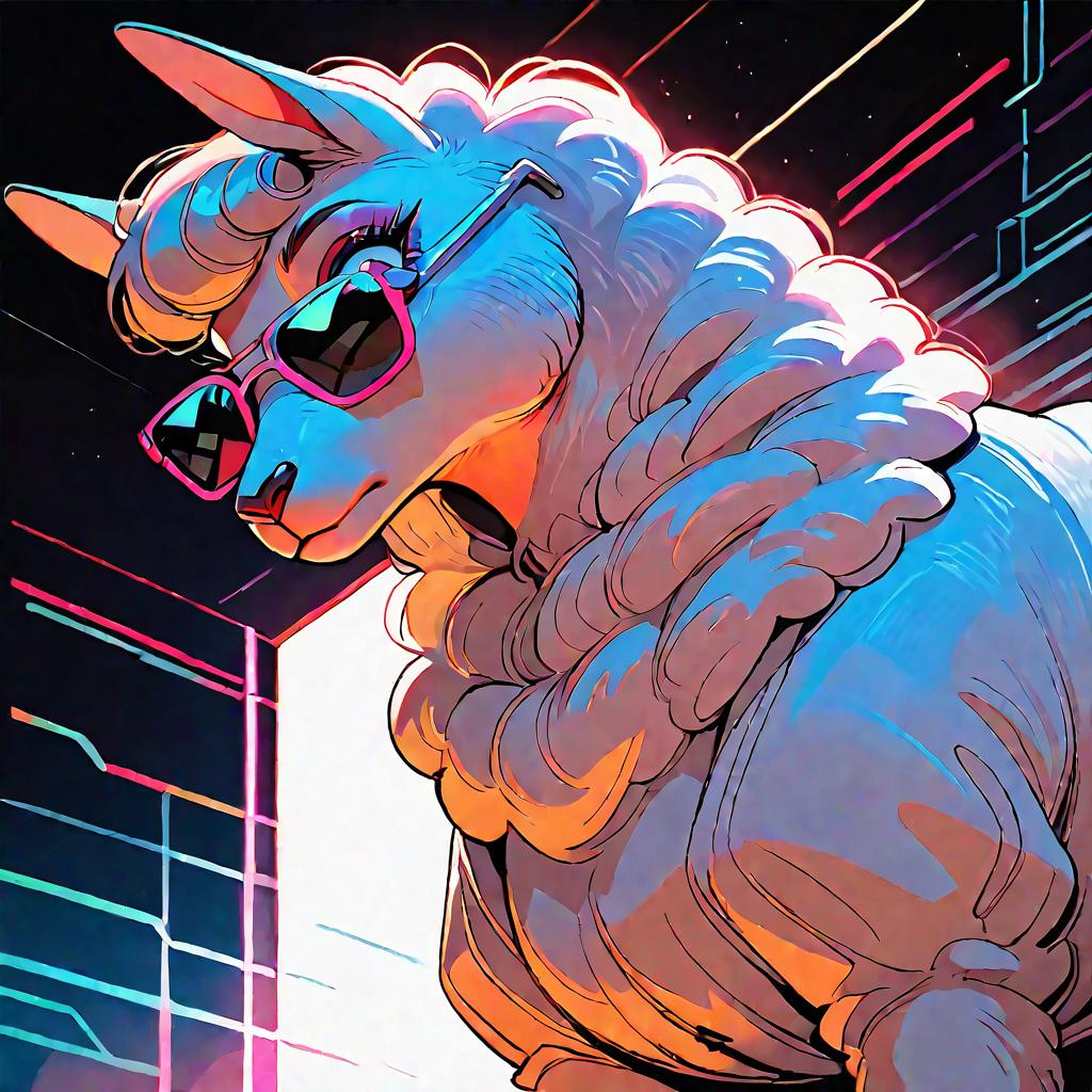 Score_9, score_8_up, score_7_up, fluffy, detailed fur, from below, dramatic, alpaca, lama, iconic sunglasses, cool, 43stl1ght1ng, low light, dramatic lighting, darkness, spotlight, neon, glow, syntwave, vaporwave, scanlines, dark background