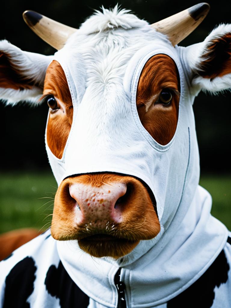 Man in Cow Suit costume, photorealistic close-up headshot