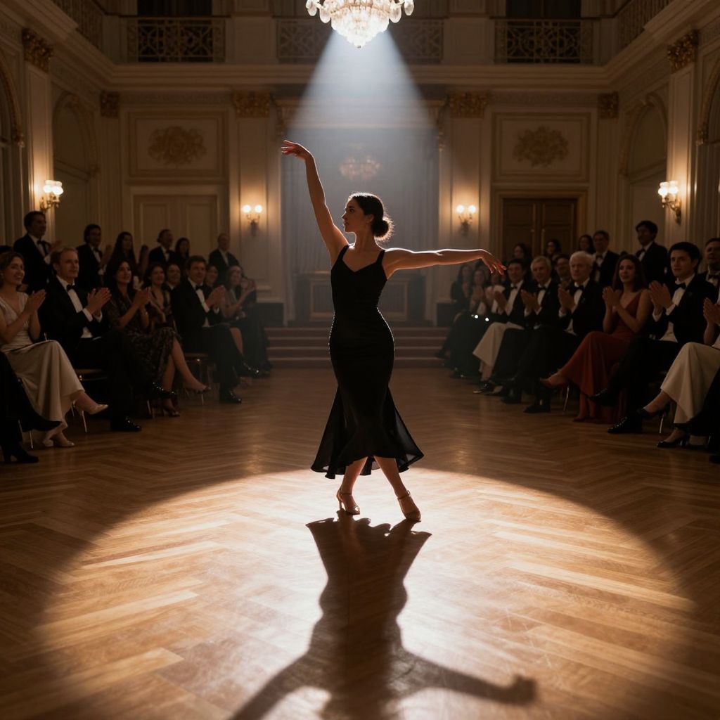 Woman dancing gracefully in the center of a grand ballroom, illuminated by a dramatic spotlight that casts her elegant silhouette against the polished wooden floor, surrounded by an applauding audience in formal attire.