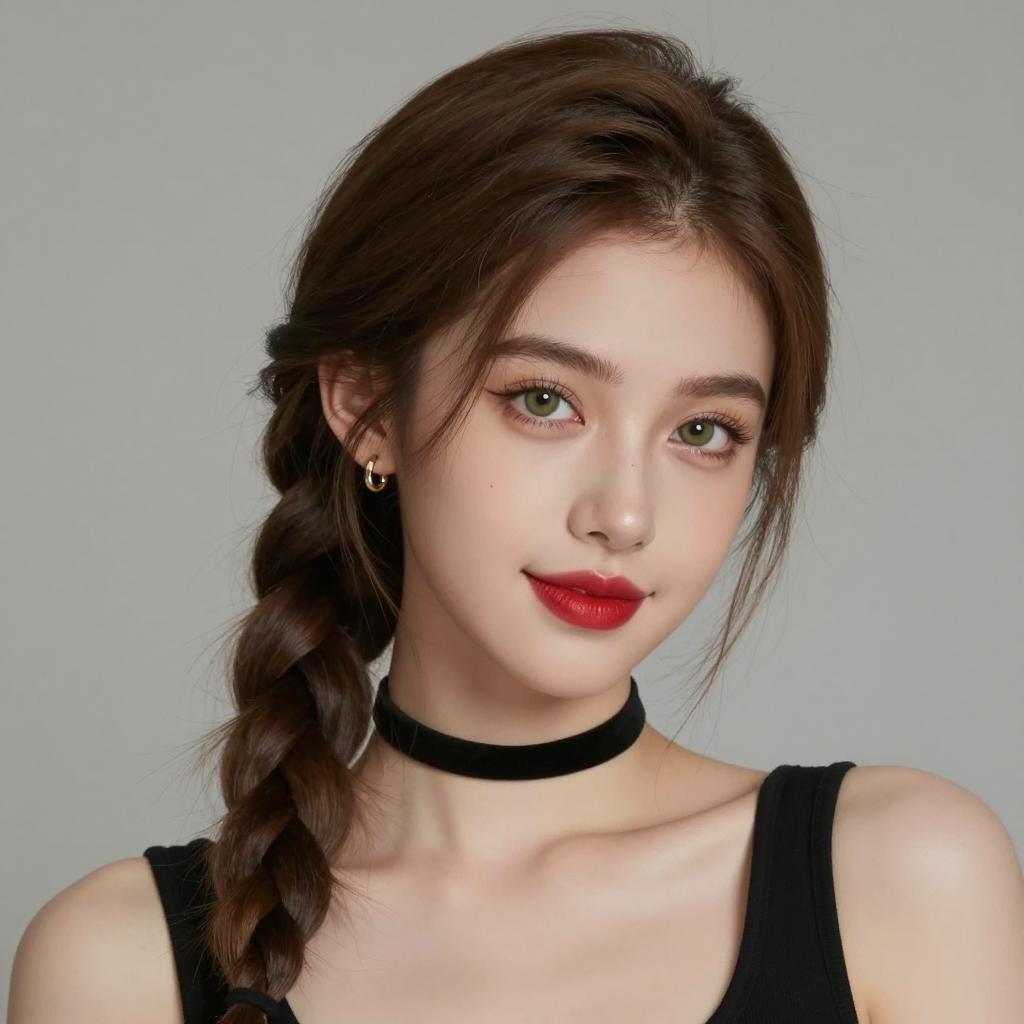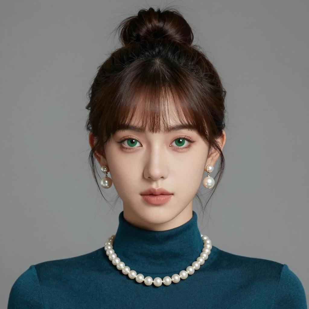 Brown colour hairstyle, photorealistic portrait of a young woman, brown hair styled in a messy updo, blue eyes, wearing a black high-neck top with puffed shoulders, black square neckline, silver necklace with a floral pendant, neutral gray background, soft lighting, realistic ures, digital art, hyper-realistic style, medium close-up, frontal view, subtle makeup, slight shadow under eyes, elegant and sophisticated look