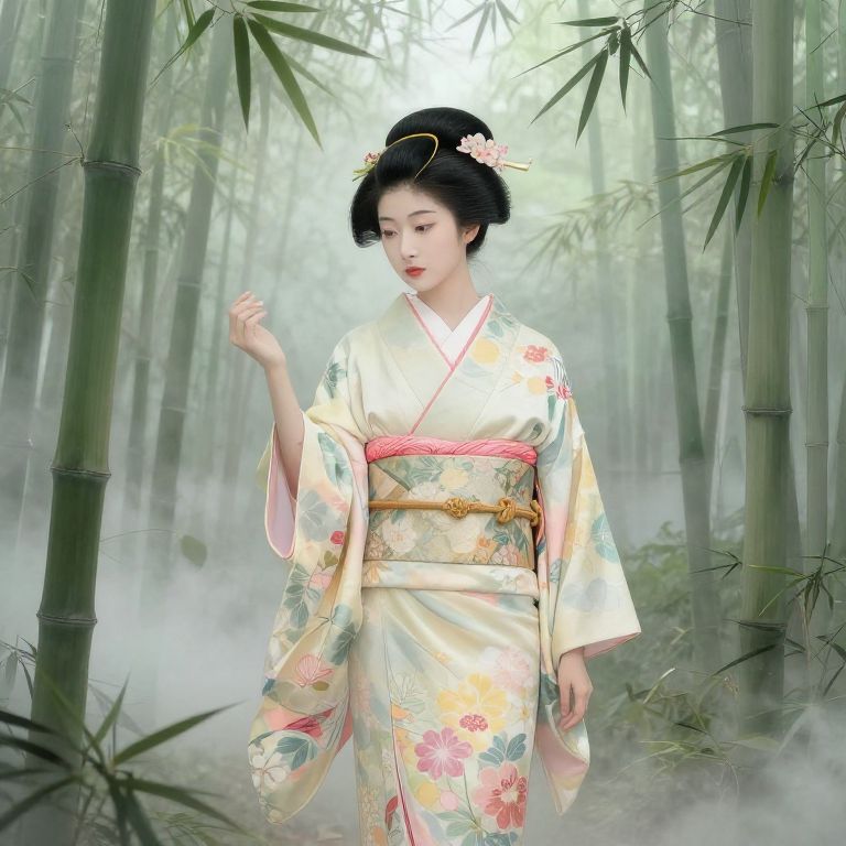 Digital painting of an elegant East Asian woman in a floral kimono, standing in a misty bamboo forest, with a delicate updo adorned with flowers