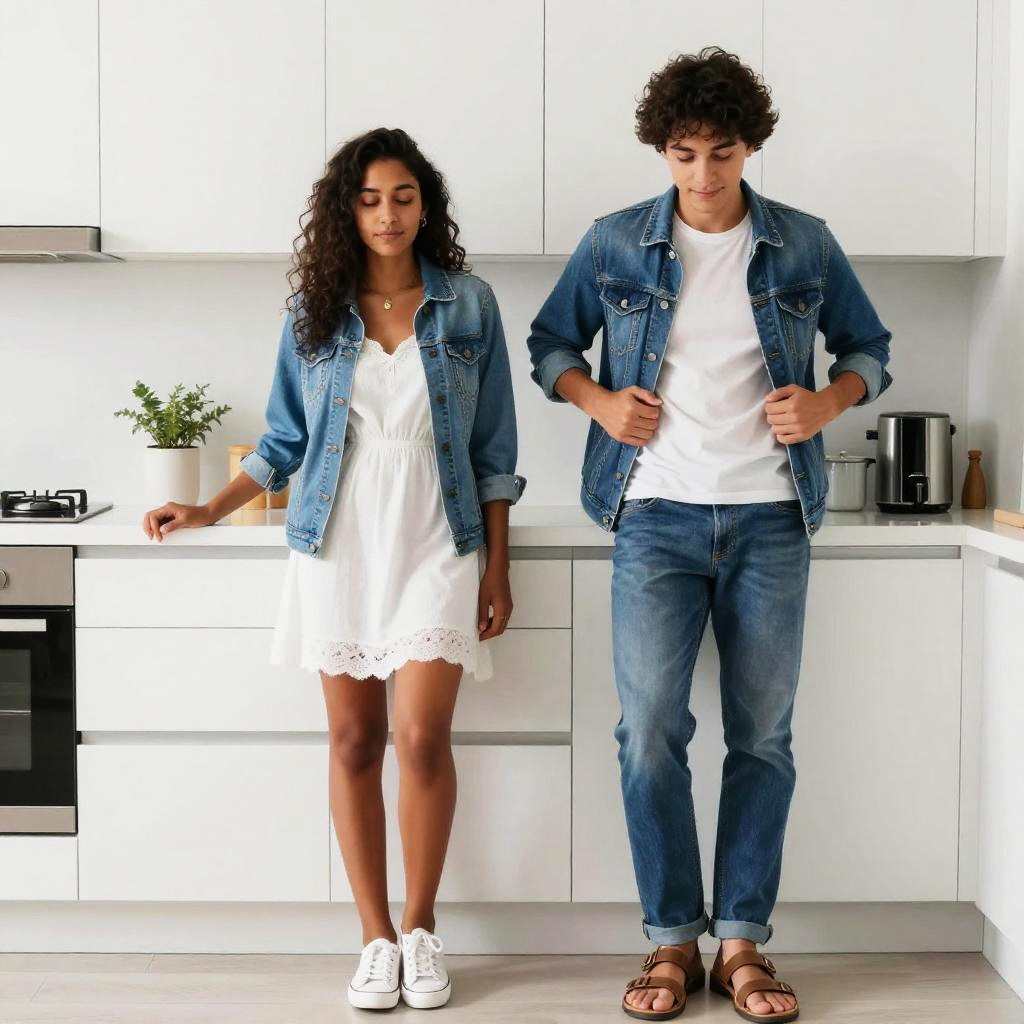 1girl, 1boy, black hair, indoors, jacket, dress, pants, blue jacket, white dress, long hair, short hair, shirt, denim, kitchen, dark skin, standing, closed eyes, white shirt, denim jacket, shoes, open clothes, open jacket, jeans, sandals, smile