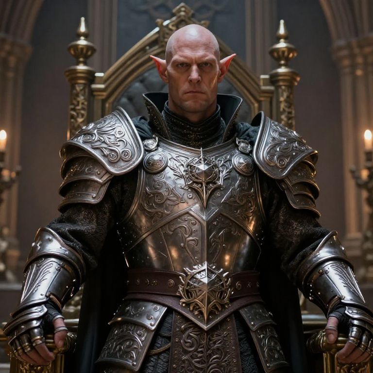 Photograph of a bald, stern-faced elf in ornate, reflective silver armor, standing in a dimly lit, Gothic-style throne room.