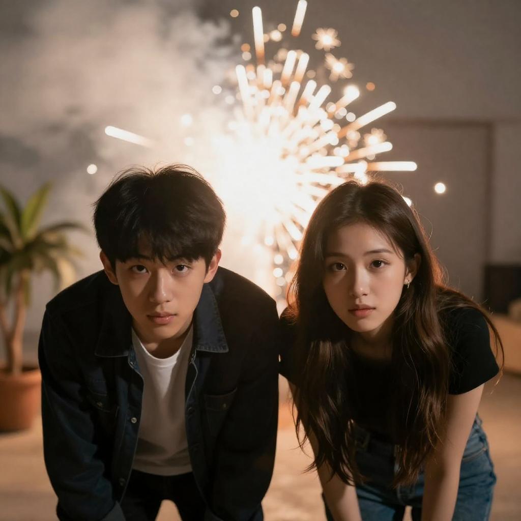 Photograph of two young people, a boy with black hair and a girl with long brown hair, leaning forward in a room. Bright explosion in background. Boy wears dark jacket, girl in dark top. Intense expressions. Potted plant on left.