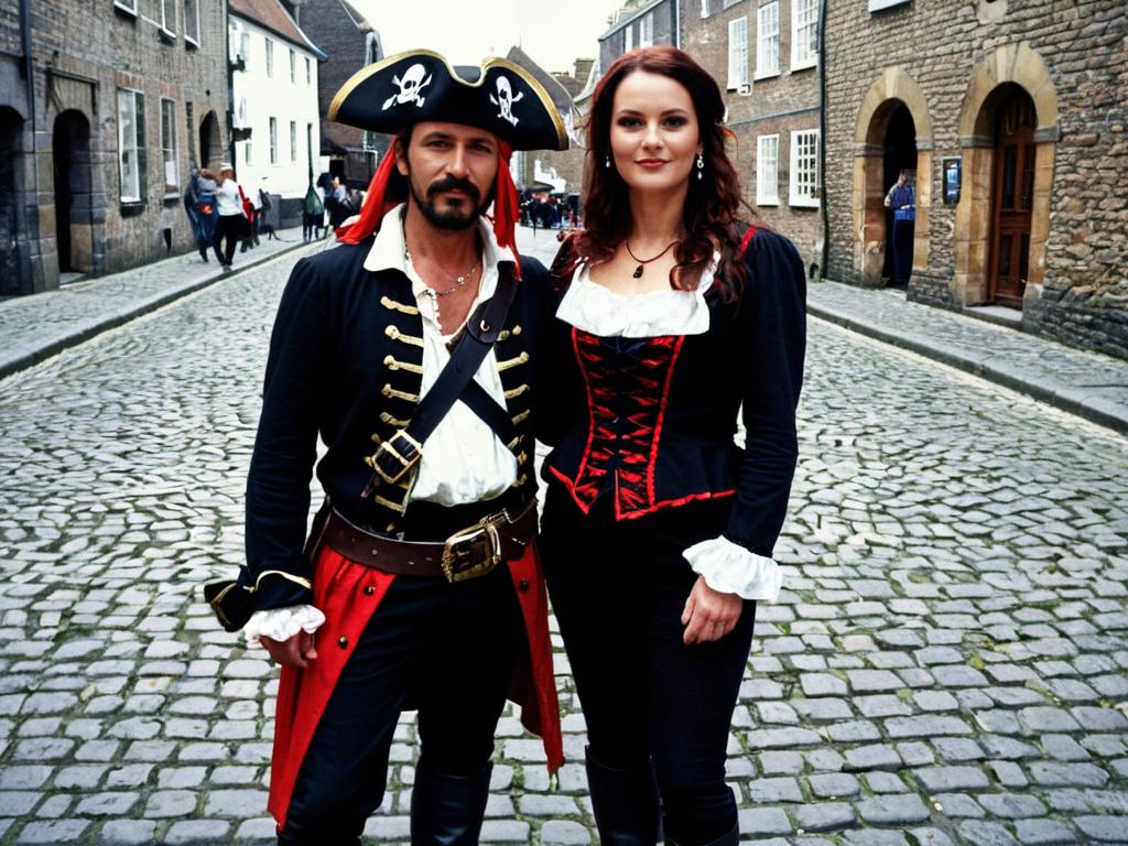 Photograph of a man and woman standing on a cobblestone street in a historic town. The man, with a black pirate hat and beard, wears a black pirate coat with gold buttons, a white shirt, and a red sash. The woman has long brown hair and wears a black corset dress with red lacing, a white blouse with ruffled sleeves. They stand closely together, smiling. The background shows old stone buildings with arched windows and doors, and a few people in the distance. The image has a high-contrast, vibrant color style.