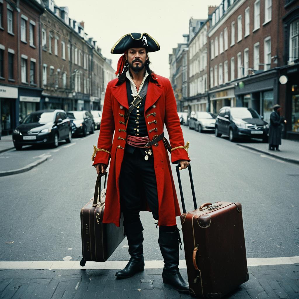 Pirates Fancy Dress Adults face swap, pirate in a black and red outfit standing on a cobblestone street