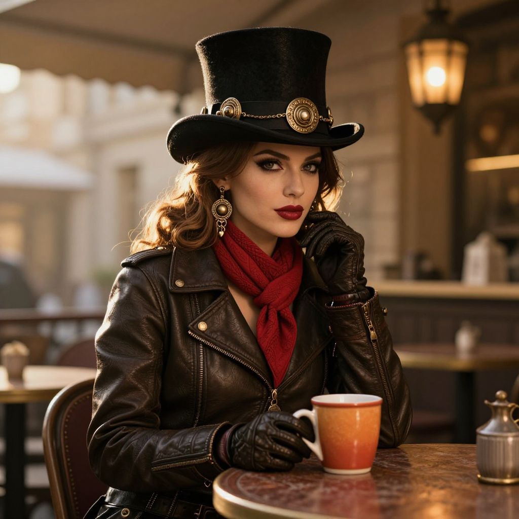 A steampunk-inspired digital artwork featuring a woman in a stylish black top hat adorned with gold embellishments, paired with a leather jacket and a red scarf, sitting at a cozy café table with a warm-toned ceramic mug, set against a backdrop of soft golden-hour lighting and hanging lanterns.