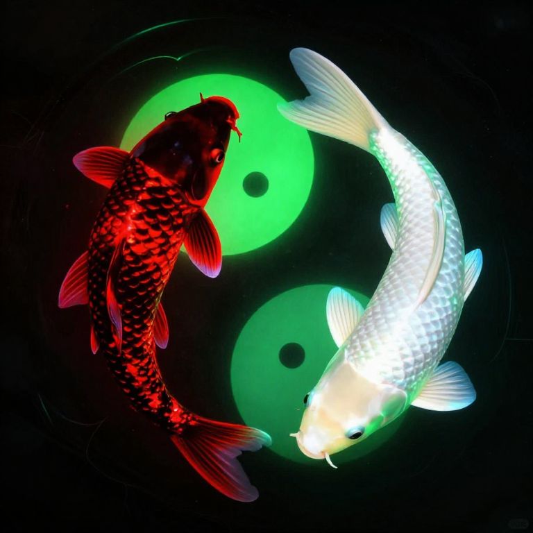Carrot two koi fish swimming around each other one black and one white representing Yin and Yang:: dark matter::1 glowing::1 by francisco de goya::1 neon red color::1 neon green color::1,