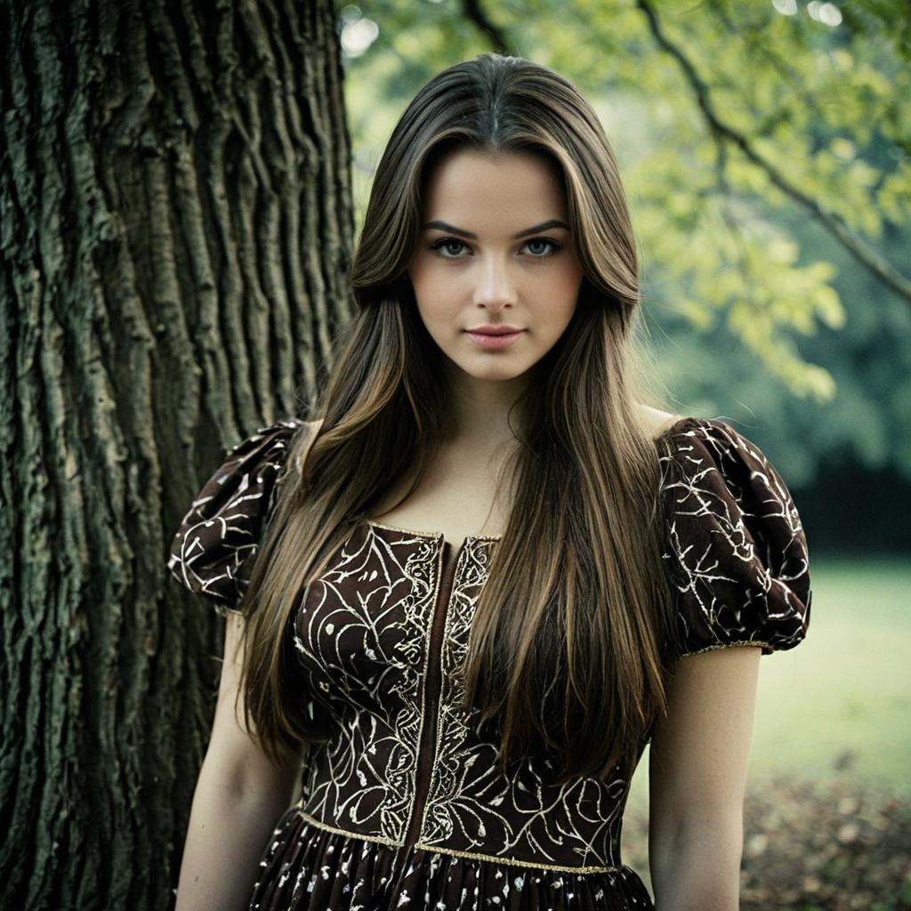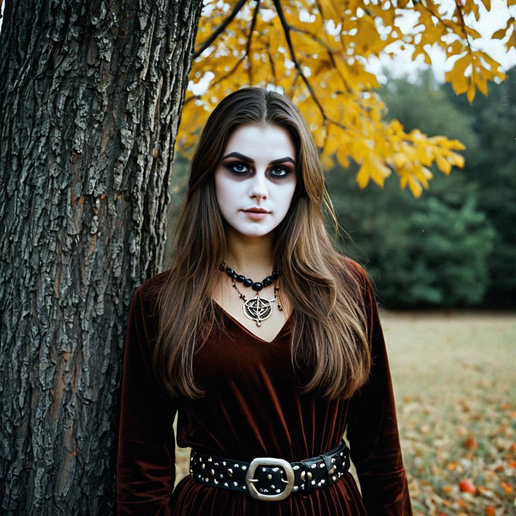 Portrait of a young woman with long brown hair and brown eyes wearing a black velvet dress with flared long sleeves, a brown belt, and a black choker with a round pendant. She stands outdoors in an autumn setting with fallen leaves and bare trees in the background.