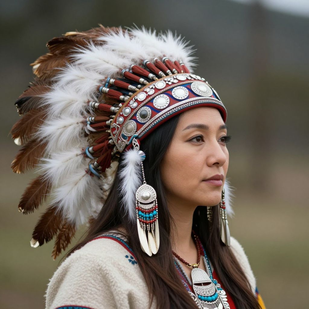 Photograph of a young Native American woman with long black hair, wearing a detailed feathered headpiece, white and brown feathers, and traditional jewelry,