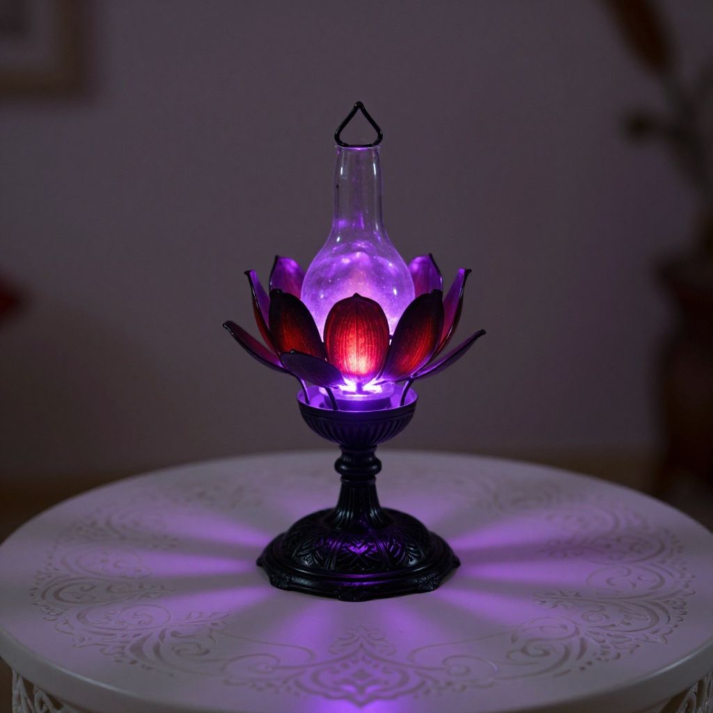 Bohemian aesthetic (friarmoody lighting, perfect features, sharp, 4k, moist skin, soft cinematic light, soothing tones, soft image), in the mystical realm of skyrim, a unique flower lamp glows with a soft purple light. crafted from black metal, it takes the form of a red and black lotus like flower, its petals shaped like a classic oil lamp. this enchanting object is perched on a white table adorned with intricate patterns, evoking an atmosphere of both elegance and mystery. the gentle glow from the lamp illuminates the surrounding area, casting long shadows and highlighting the delicate details of the table's design. . free spirited, eclectic, colorful, highly detailed