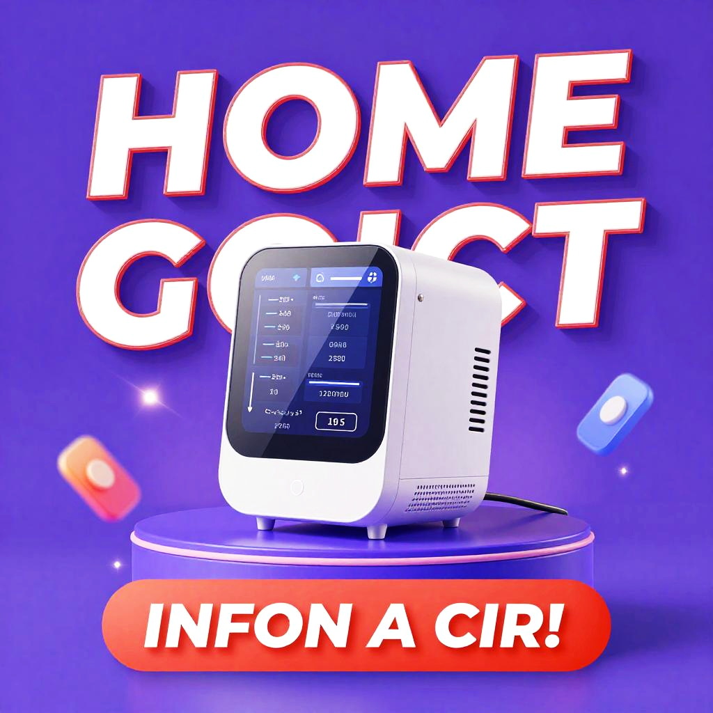 Infomercial poster featuring vibrant colors and dynamic typography, showcasing a futuristic home gadget surrounded by glowing light effects and bold call-to-action text with high contrast, hyper-realistic style.