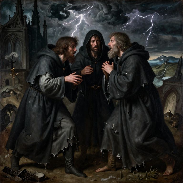 Photorealistic painting of three bearded men in dark robes, arguing under a stormy sky with lightning, in a ruined Gothic cathedral.