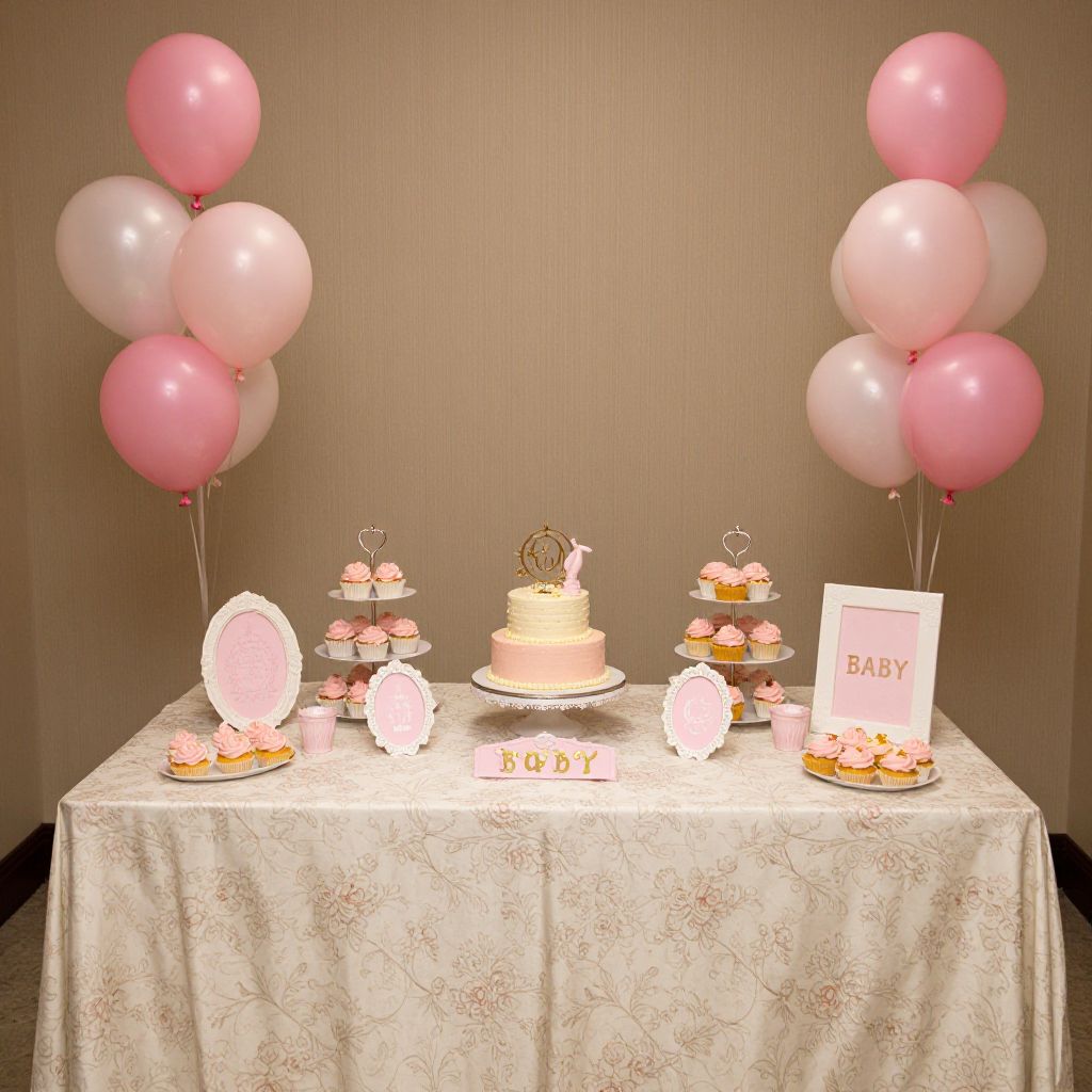 Photograph of a baby shower table with pink and white balloons, white floral tablecloth, baby-themed cake, cupcakes, and "Baby" sign.