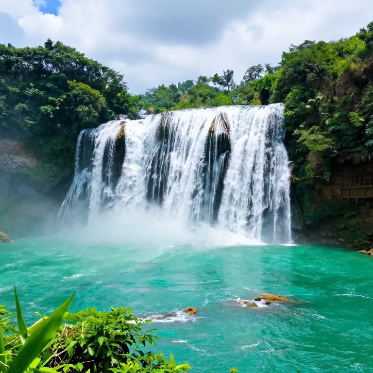 An intricate digital artwork depicts a breathtaking waterfall tumbling down a mountain from an unusual overhead viewpoint. The cascading water plunges into a tranquil pool below, creating a mesmerizing scene of nature's power and serenity in perfect harmony. Vibrant greens and blues dominate the landscape, with trees and foliage gently reflected on the mirror-like surface of the calm waters, evoking both tranquility and awe.