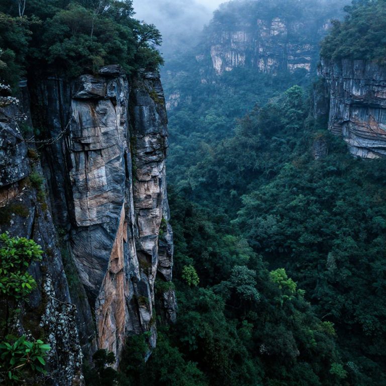 Jabal towering cliff face overlooking deep valley, dense forest at base, soft fog weaving through tree tops, cool blue and green color palette, high contrast lighting, detailed natural elements like moss and lichen, cinematic wide angle landscape scene