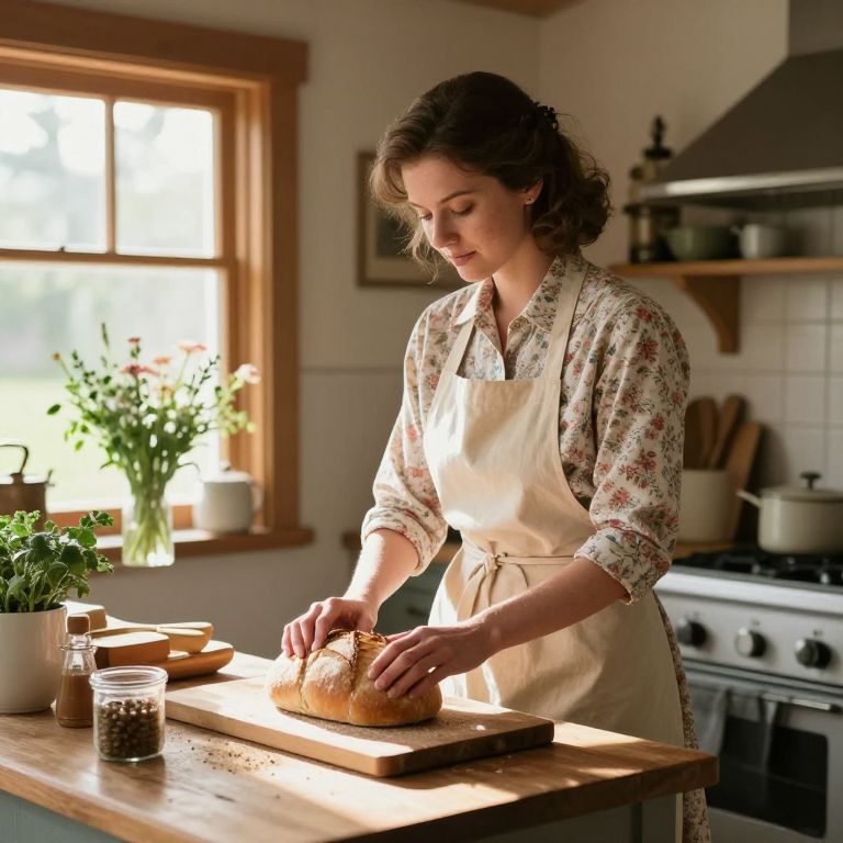 Photograph: Young woman with wavy brown hair, floral blouse, beige apron, slicing bread on wooden countertop in sunlit, cozy kitchen