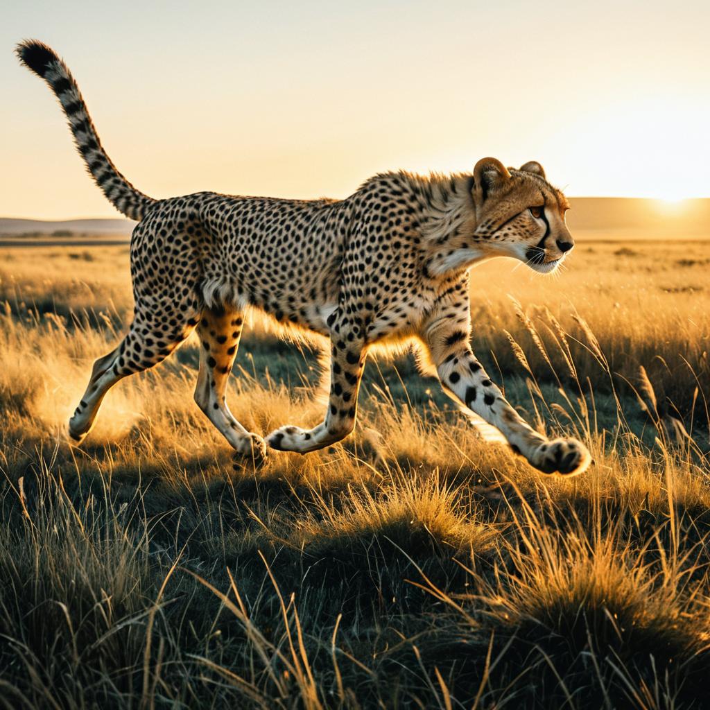X-Ray artwork of a cheetah sprinting across the grasslands, a golden sunrise illuminating the plains, detailed skeletal structure with soft luminescent accents