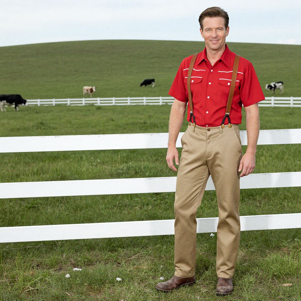 A man, short-sleeve rockabilly work shirt in bright red, slim-fit khaki chinos, vintage-style brown leather suspenders, scuffed brown desert boots, rolling green pastures, white picket fences, grazing Holsteins, lithographic film style, confident smile, relaxed demeanor. Man has masculine face and piercing eyes