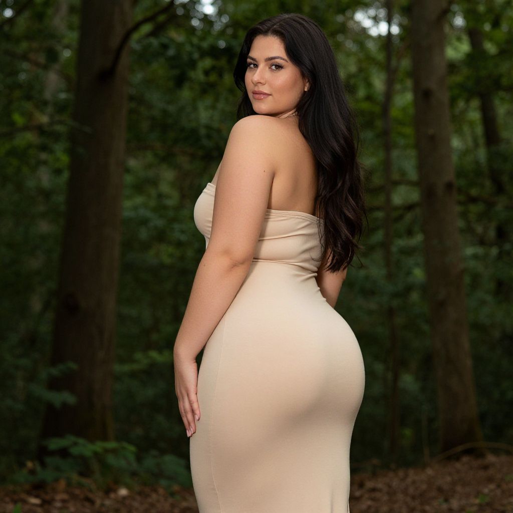 Photograph of a curvy woman with long, dark brown hair standing in a forest. She's wearing a tight, strapless, beige dress that accentuates her hourglass figure and prominent hips. She's looking over her shoulder with a slight smile. The forest background is lush with tall trees and greenery, creating a serene, natural setting. Her skin is a warm olive tone.