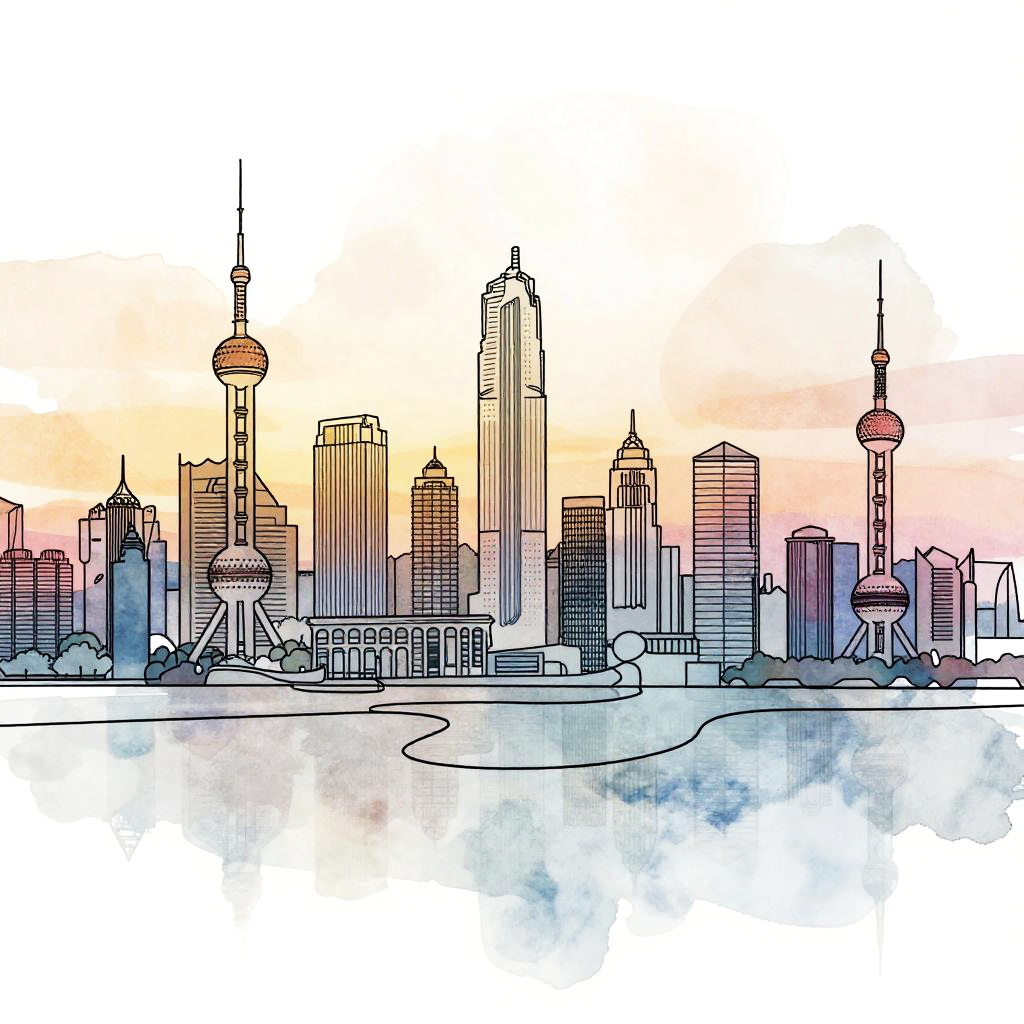 Continuous line drawing generator creating a city skyline at sunset, one continuous black line weaving through iconic architectural features, minimalist yet detailed composition with soft watercolor background, contemporary urban art style.