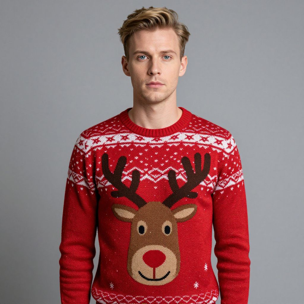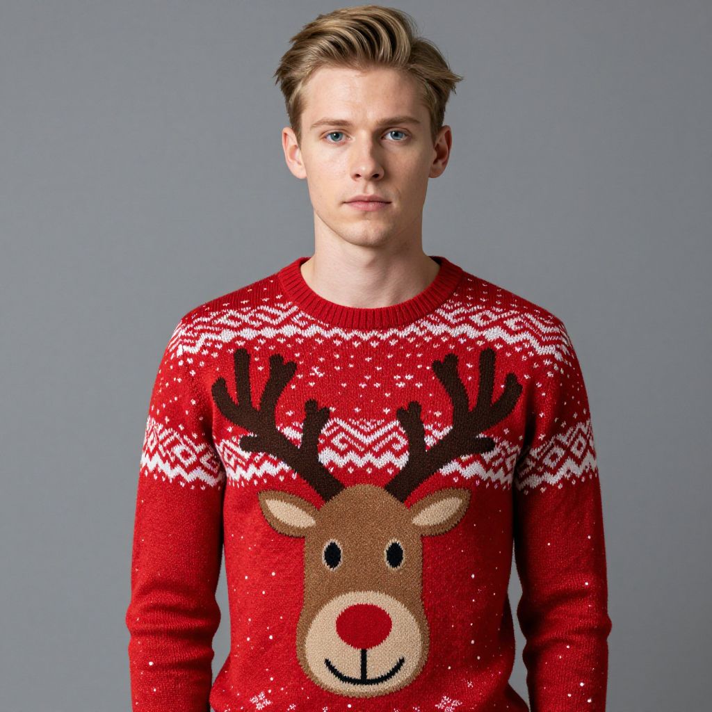 A photograph of a fair-skinned, blue-eyed man with short, blond hair, wearing a festive red and white knit sweater with reindeer patterns. The sweater features a large reindeer face on the front with brown antlers and a red nose. He's standing against a plain gray background, looking directly at the camera with a neutral expression.