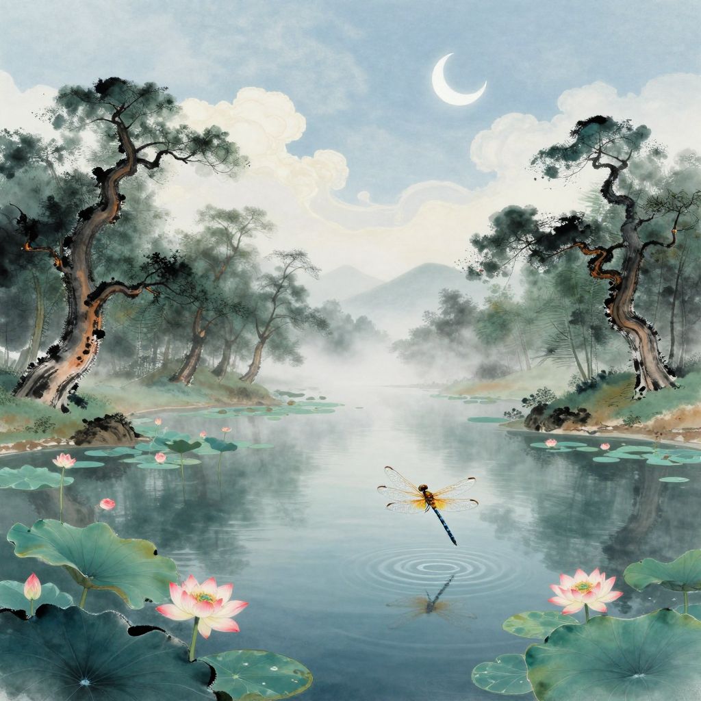 Create an image of a tranquil Zen garden in the tradition of Japanese ink painting, characterized by its precise and delicate lines. Within this serene space, depict raked sand patterns forming intricate waves and drifts around a central pond from a unique 'bug's-eye view' perspective. A dragonfly hovers above the water, its wings shimmering with iridescence against the calm surface that mirrors the surrounding bamboo grove. This scene, captured in meticulous brushstrokes and harmonious balance, conveys feelings of peace and reflection amidst the bustling world outside.
