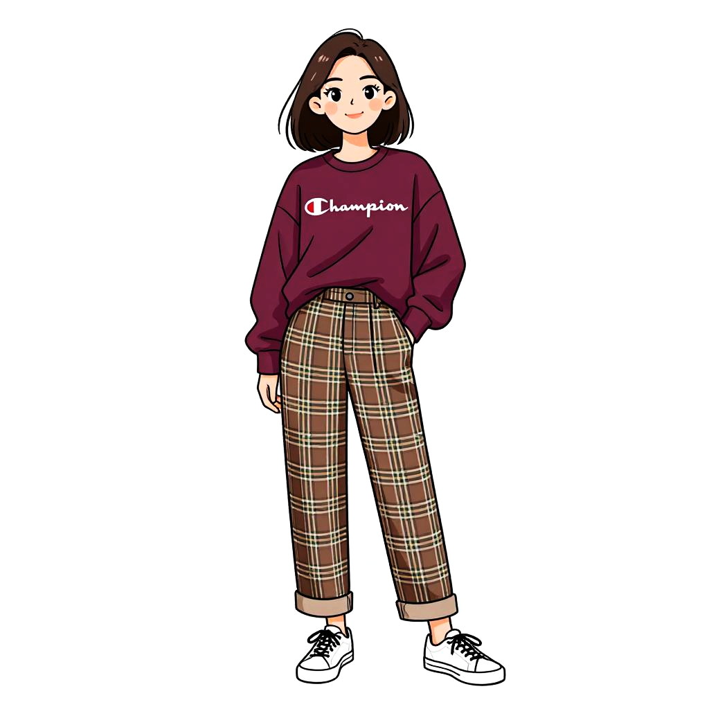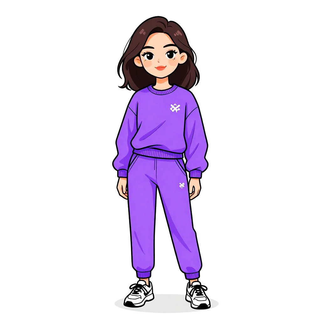 Woman with pretty face and pretty hair. Woman, casual sporty, coordinated lilac tracksuit, crew neck sweatshirt, logo detail on chest, long sleeves, ribbed cuffs, matching jogger pants, side pockets, logo near pocket, tapered leg, white and black sneakers, white studio background --sref 1467